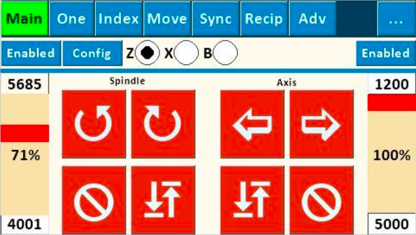 To reset after a stop, touch the stop button (shown to the right). You will have to do this for both the spindle and the axis in use.