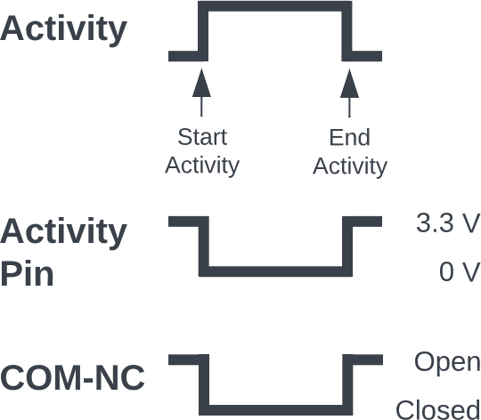 The activity diagram on the right shows the timings. When an activity is initiated on the Nextion touch screen (the top line), the Teensy will take the output for the selected pin from 3.3 VDC to 0 VDC (the second line). When that activity is completed, the Teensy will take the output for the selected pin from 0 VDC back up to 3.3 VDC. When that activity is completed (e.g., when using Sync or MultiSync) or stopped by the user, the Teensy will take the output for the selected pin from 0 VDC back up to 3.3 VDC. This output is then used to switch a relay. Identifying the Pin Used Using the Config More panel, a pin is identified as the Auxiliary Pin for this use (which matches the one wired for this use).