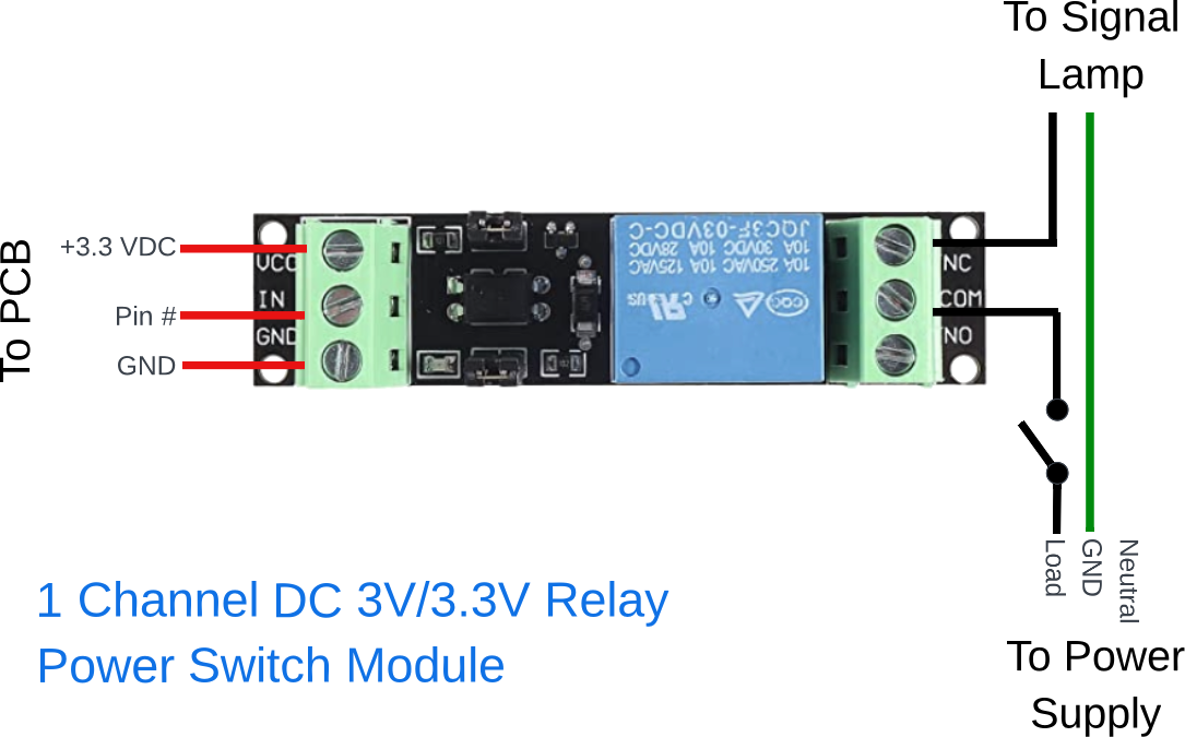 The switched side of the relay (right side in the picture to the right) needs to be connected to the power supply for the signal lamp.