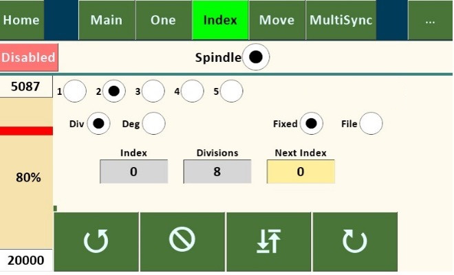 In this example screen, only the Spindle can be indexed as it is the only axis configured for radial use in the configuration settings. If M3 or M4 were configured as radial (vs. linear), they would show up here.