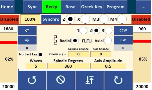 This option is used to run the spindle and M3 stepper motors synchronously at the specified percentages. Negative numbers run the spindle and M3 in opposite directions. This option only works if the Synchro function button is enabled (not red). This function is useful for activities such as having the spindle and the rosette(s) run at different revolutions per minute (i.e., a second stepper motor is driving the rosette's rotation). |