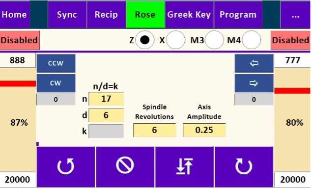 Purpose: This screen allows for the creation of a rose or single stage geometric chuck patterns (see also, Wikipedia Rose (mathematics) -- the math explaining how the variables work is explained there).