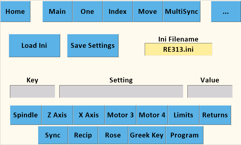 This identifies if the M3 and/or M4 axes are available. The value is typically 4, but may be 5 if the v3.0 printed circuit board (PCB) is being used. ELFOS 3.0.8: Beginning with 3.0.8, this setting has no effect on the operation of the system. Even if you are using a 4-axis PCB, the options for M4 will be shown. Note regarding the Teensy 3.2: If the Teensy 3.2 is being used as the controller, this needs be 4 (regardless of the PCB being used). Note: This value cannot be set via the menus; the ini file is the only option for setting it. |